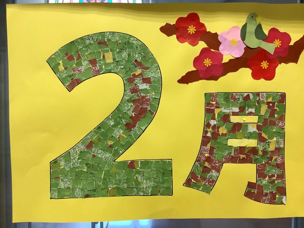 徳島 蓬莱荘です。あっという間に2月になりました。本当に早いですね。 今月のみんなで作った作品を紹介します。 今月は、パンジーを作成しました。 パンジーは、鉢やプランターに植わっていることが多いので、画用紙で作ったプランターに貼りました。 今回も、たくさん作成したので、たくさん貼りました。なじみがある花なので、「華やかでええな」「植えたことある」など話されていました。 これは、梅とうぐいす この作品は、...
