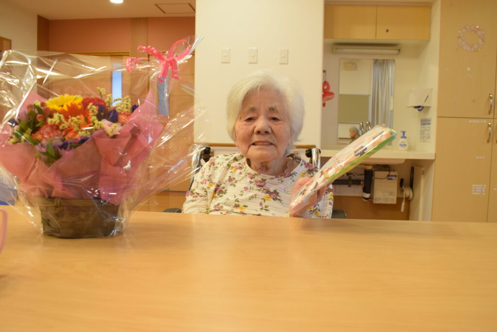 こんにちは、ケアプラザ多摩です。今回は、ケアハウスの敬老会です。皆さんお元気で歩かれる方もたくさんいらっしゃいます。 もちろんご家族も楽しみにされています。 100歳を超えられると、毎年《敬老会》に参加されます。 もちろん来年もご一緒しましょう。 今年は、紅白饅頭と花束を頂きました。 来年は何かしら? 最後はみんな揃って記念撮影! おめでとう!おめでとう!おめでとう...