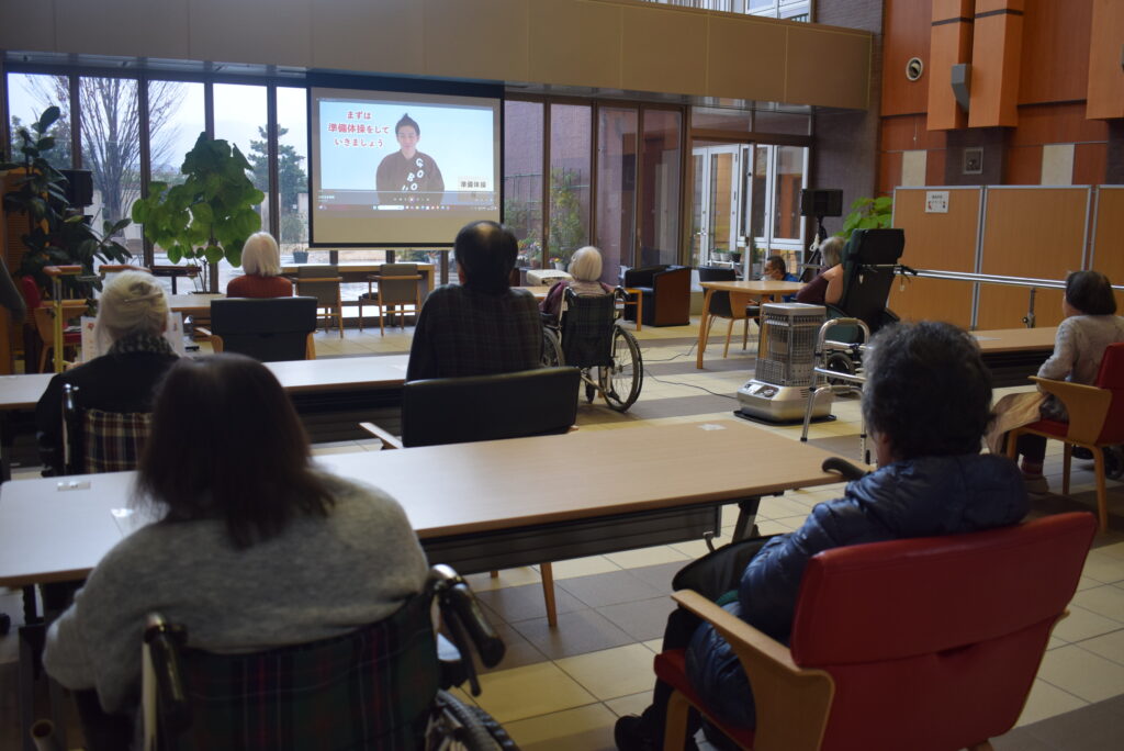 こんにちは、ケアプラザ多摩です。今日の外は、あいにくの雨模様。寒い寒い。こんな日は、お部屋で体操しましょ! 「さあ、みなさん手を挙げて、グーパーから始めますよ」職員の声に励まされ、動ける範囲で手を動かします。 職員さんの方をきちんと見つめて、頑張ります。 痛いところがあるけれど、それでも何とか頑張ります。あれあれ、隣のユニットでも体操が始まりましたよ。 こちらは、DVDを見ながら「ごぼう先生の体操」です...