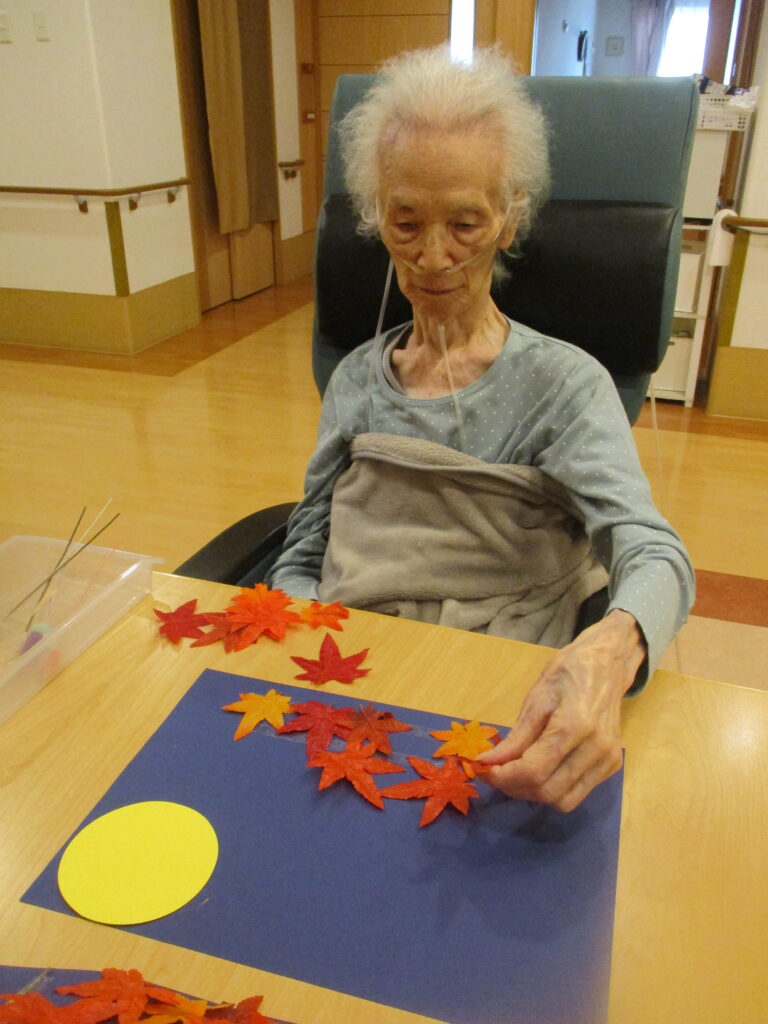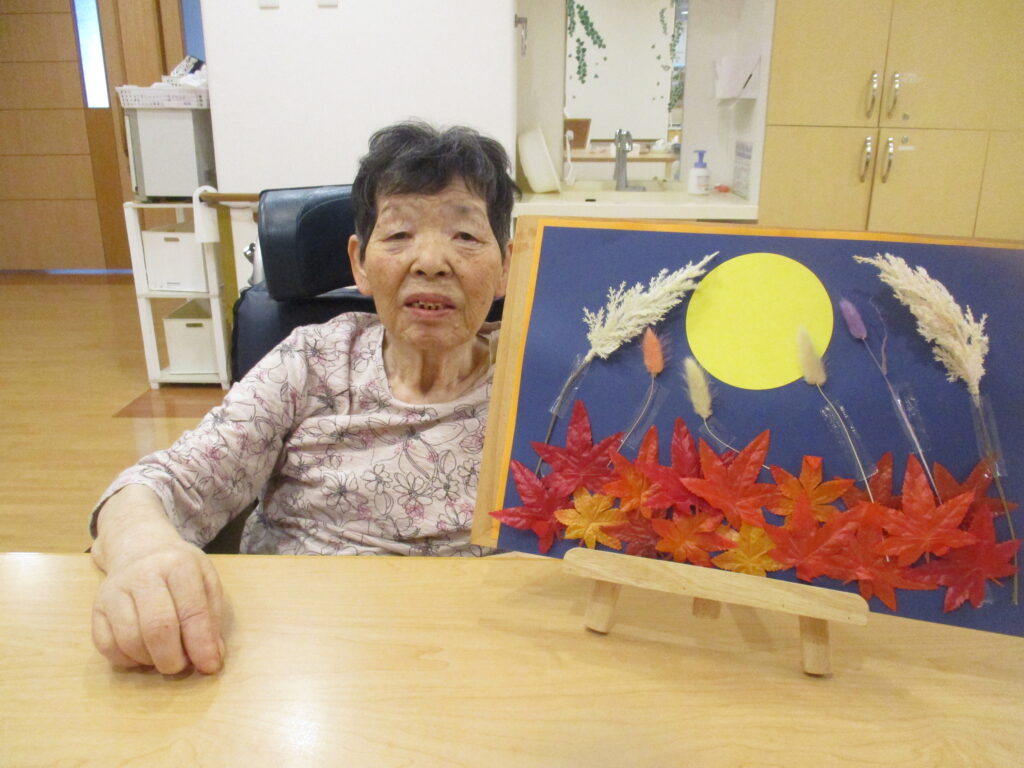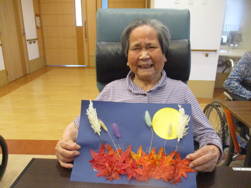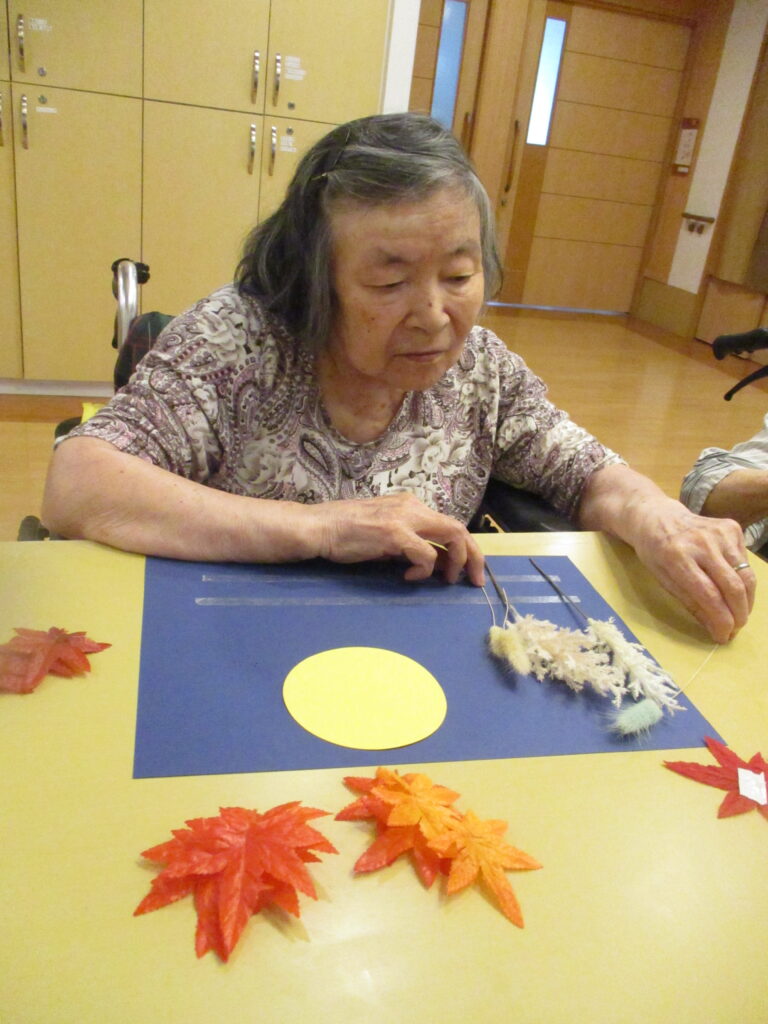 撫子ユニットではお月見飾り作りをしました。皆様思い思いに紅葉やお月様を飾っていき、一枚の絵に仕上げておりました。