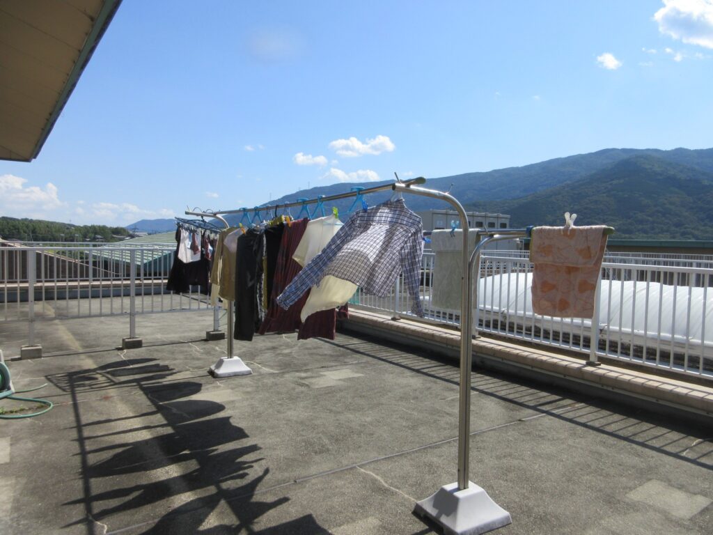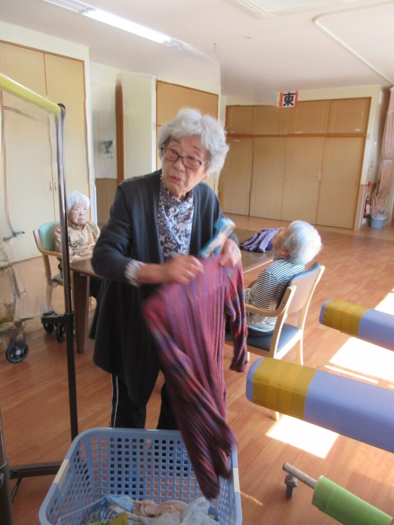 いつもは洗濯が洗い終わると乾燥機で乾燥をしていますが、秋晴れの良いお天気が続いていたので洗濯物を外で干す作業をお手伝いして頂きました👚