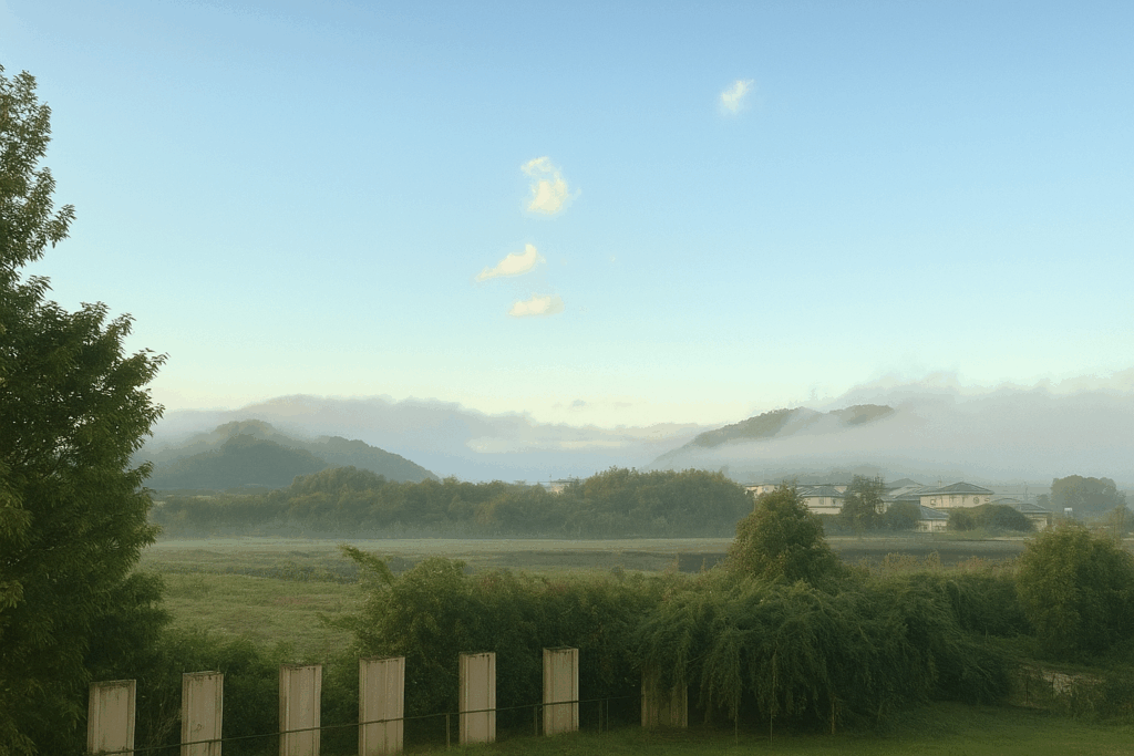 静けさの中にやすらぎがある——そんな秋の夜を、今日も穏やかに過ごしています。そして、静かな夜が明けると、東の空が少しずつ明るくなり、山あいに朝霧がかかっていました。——季節の変わり目を感じる穏やかな一日の始まりです。