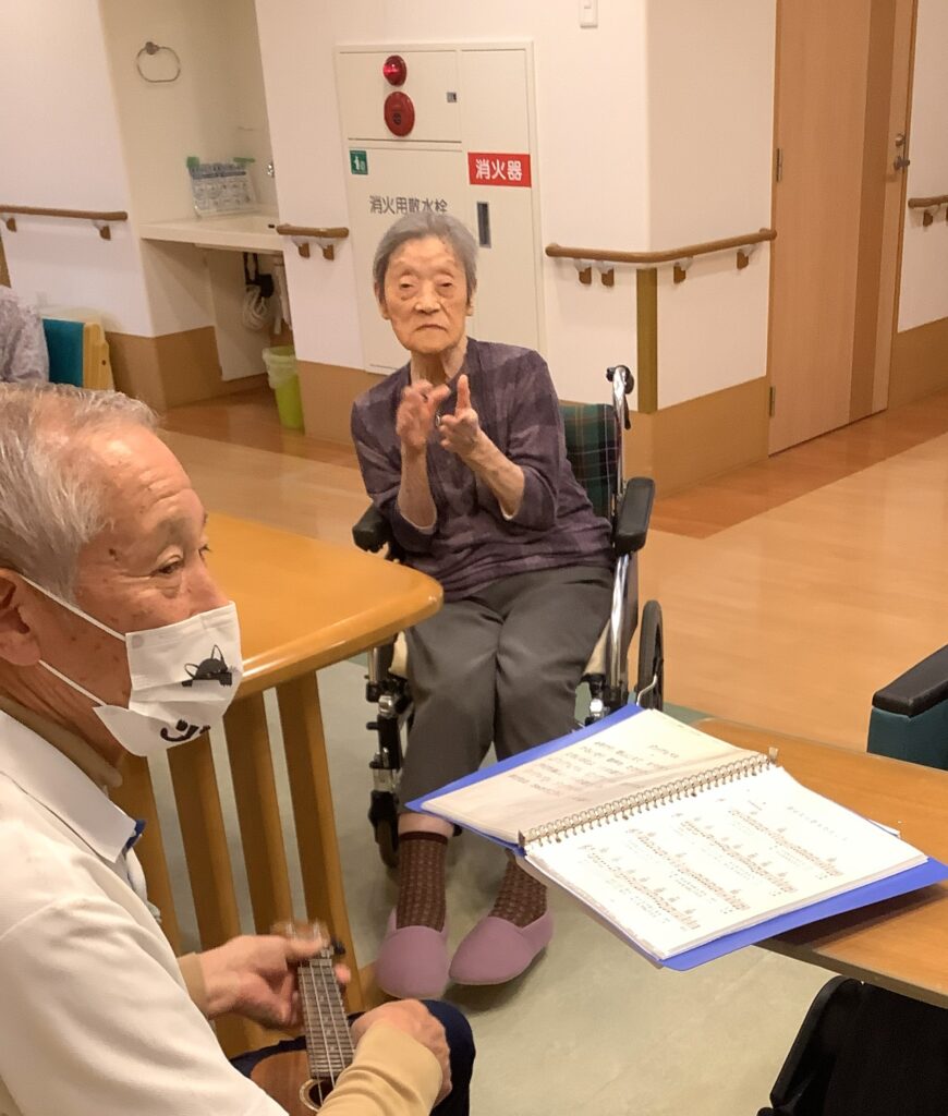 先日、職員によるウクレレ流しが行われ、フロアには優しいウクレレの音色が響くと、利用者様の表情がふわっと明るくなり、自然と手拍子をしたり、口ずさんだりと、和やかな笑顔でいっぱいになりました😊。特に「幸せなら手を叩こう👏」の曲が流れた時には、皆様が歌に合わせて手を叩き、フロア全体が一体になったようなとても温かい空気に包まれました!!