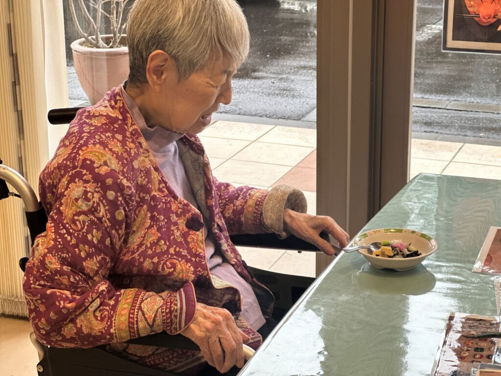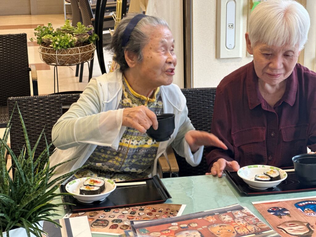「久し振りの巻き寿司ね」「このお汁粉もなかなかおいしいわよ」