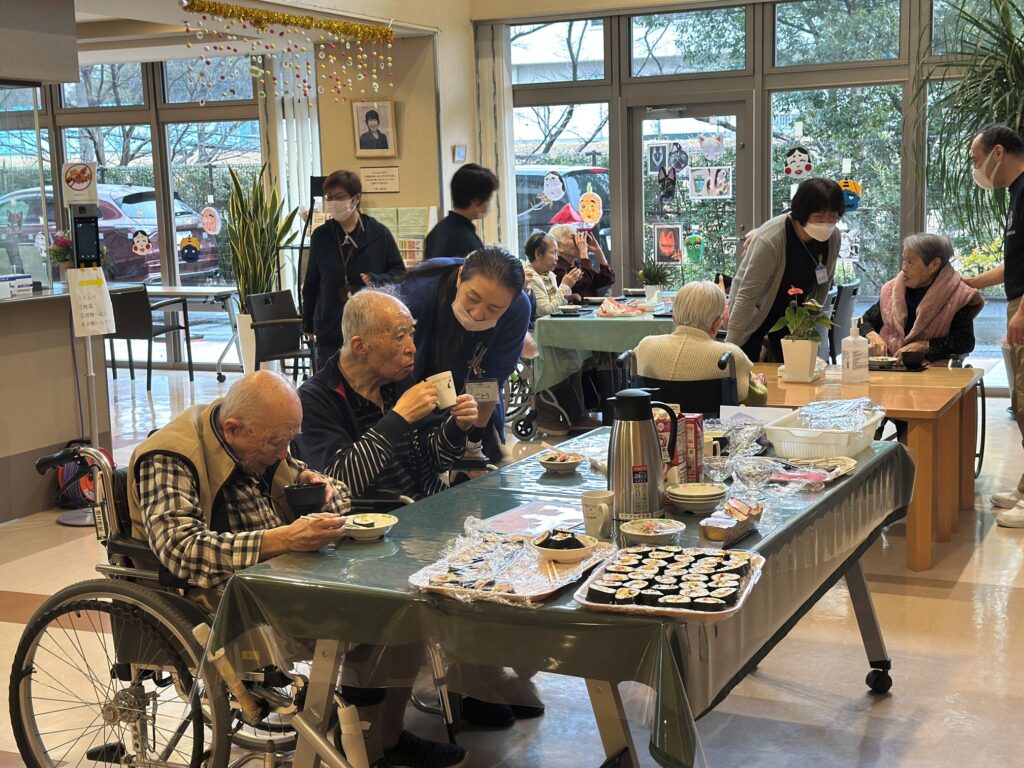玄米茶・甘酒・お汁粉・りんごジュース・プリン・巻き寿司と