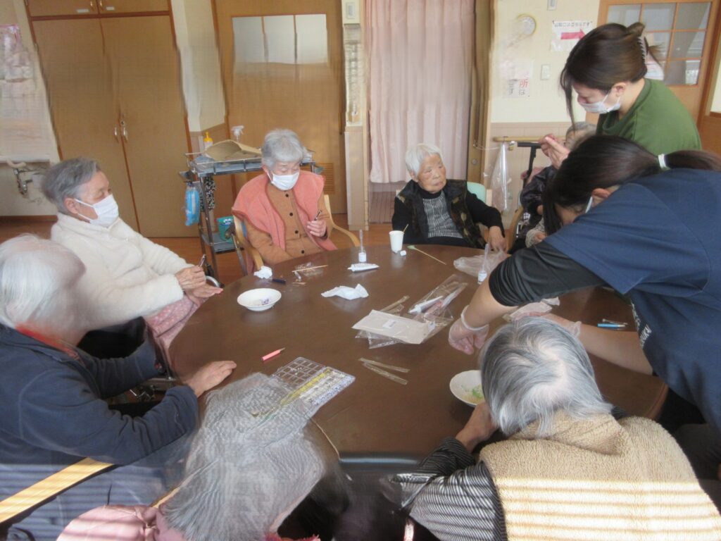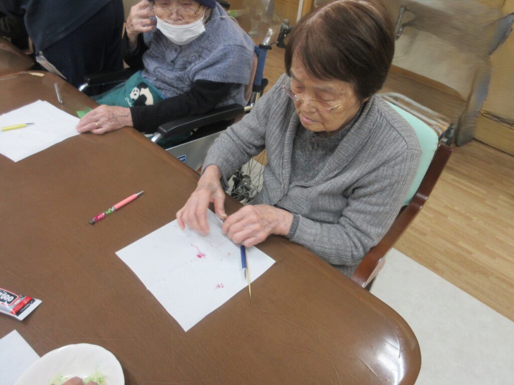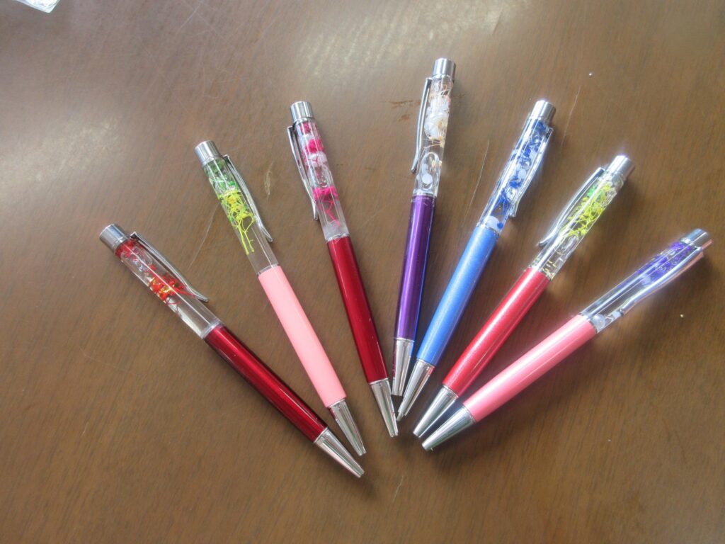 以前、支援学校の生徒さん達が来荘されプレゼントを頂いたので、何か利用者さんとできないかと考えハーバリウムボールペン作りを行いました(^^)