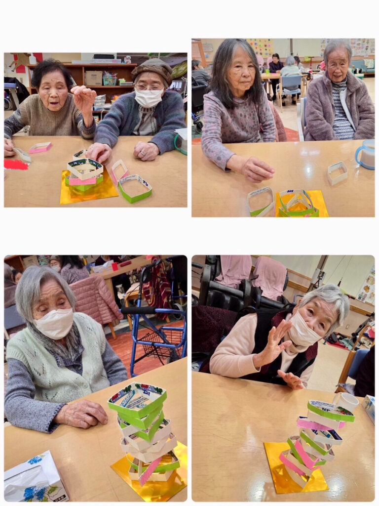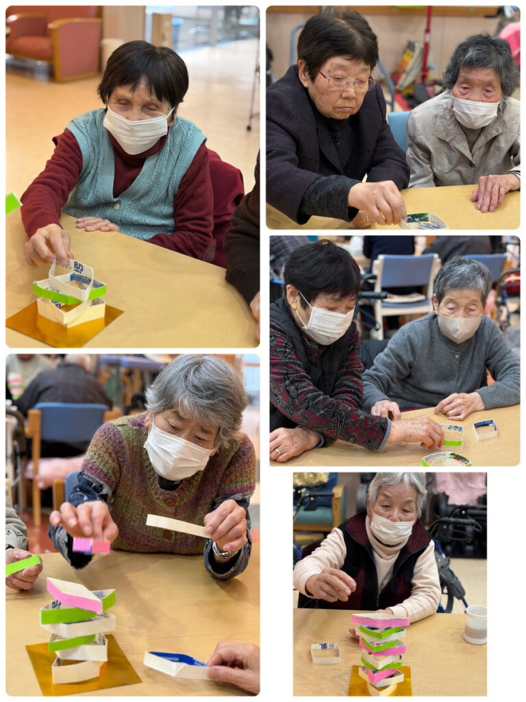 3色のひし餅を上手く積み上げるのに皆さん真剣です‼