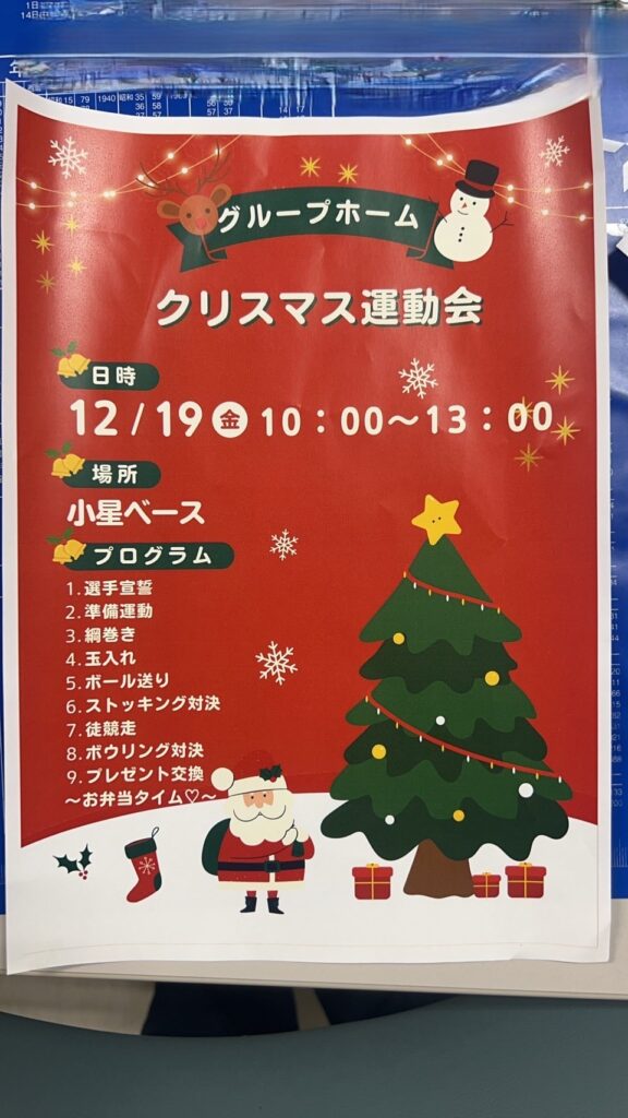 美馬拠点グループホームです。 12月19日に美馬市にある小星ベースをお借りして、利用者さん、家族さんとクリスマス運動会を開催しました👏 プログラムはこちら♪ 綱巻き対決 棒に紐がついており、巻き取り勝負!! 玉入れ 動くカゴに玉を入れていきます。 不規則に動くカゴに何個入るかな? 頑張れー!!! ボールおくり 隣の人にボールを渡していきます(*^^*) ストッキング対決 頭からストッキングをかぶって互いに引っ張 ......