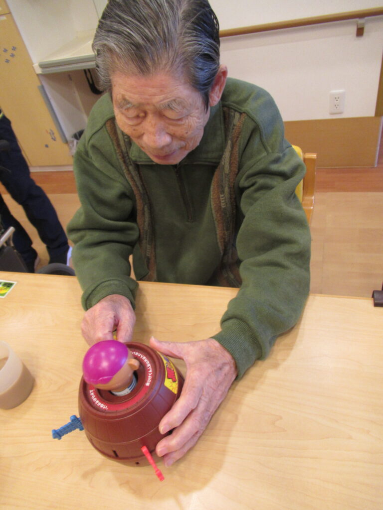 蒲公英ユニットではクリスマス会の締めに入居者の皆さんで黒ひげ危機一髪を行いました。悩みながら「どこにしようかな?」と剣を刺す方もいれば、「ここだ!」とすぐに剣を刺す方もいて十人十色でした。黒ひげが飛び出した時には歓声があがり、大盛り上がりの中クリスマス会を締めることができました。 ...