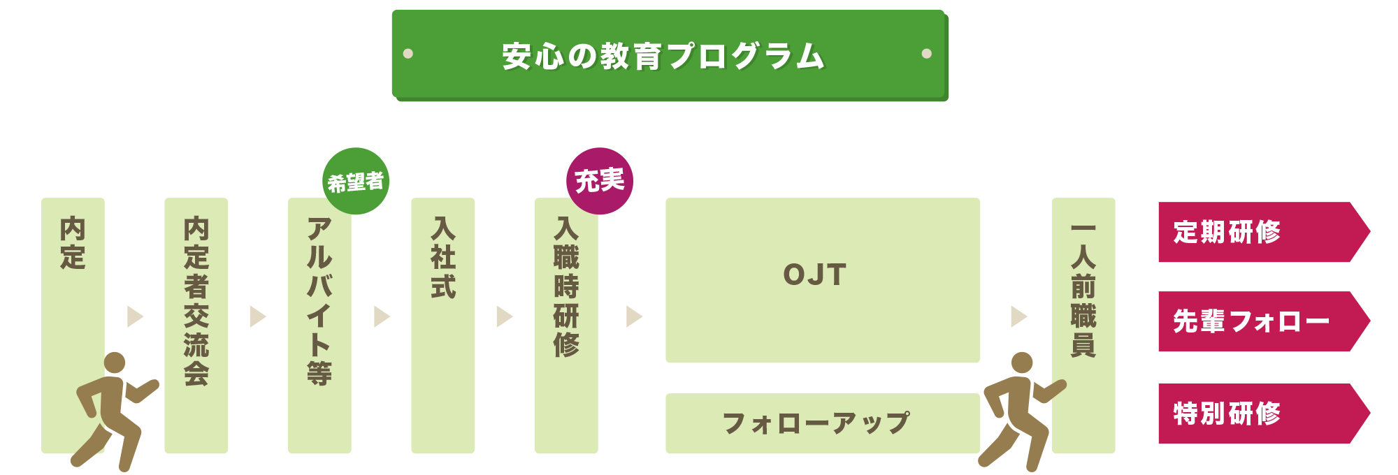 OJT期間終了後もフォローの研修や面談により、安心して一人前の職員として現場に入っていただけるようにいたします。